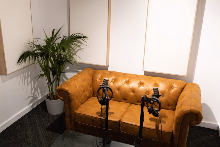 Elevate your conversation with broadcast-grade audio. A quiet, comfortable space designed for clear communication and content.